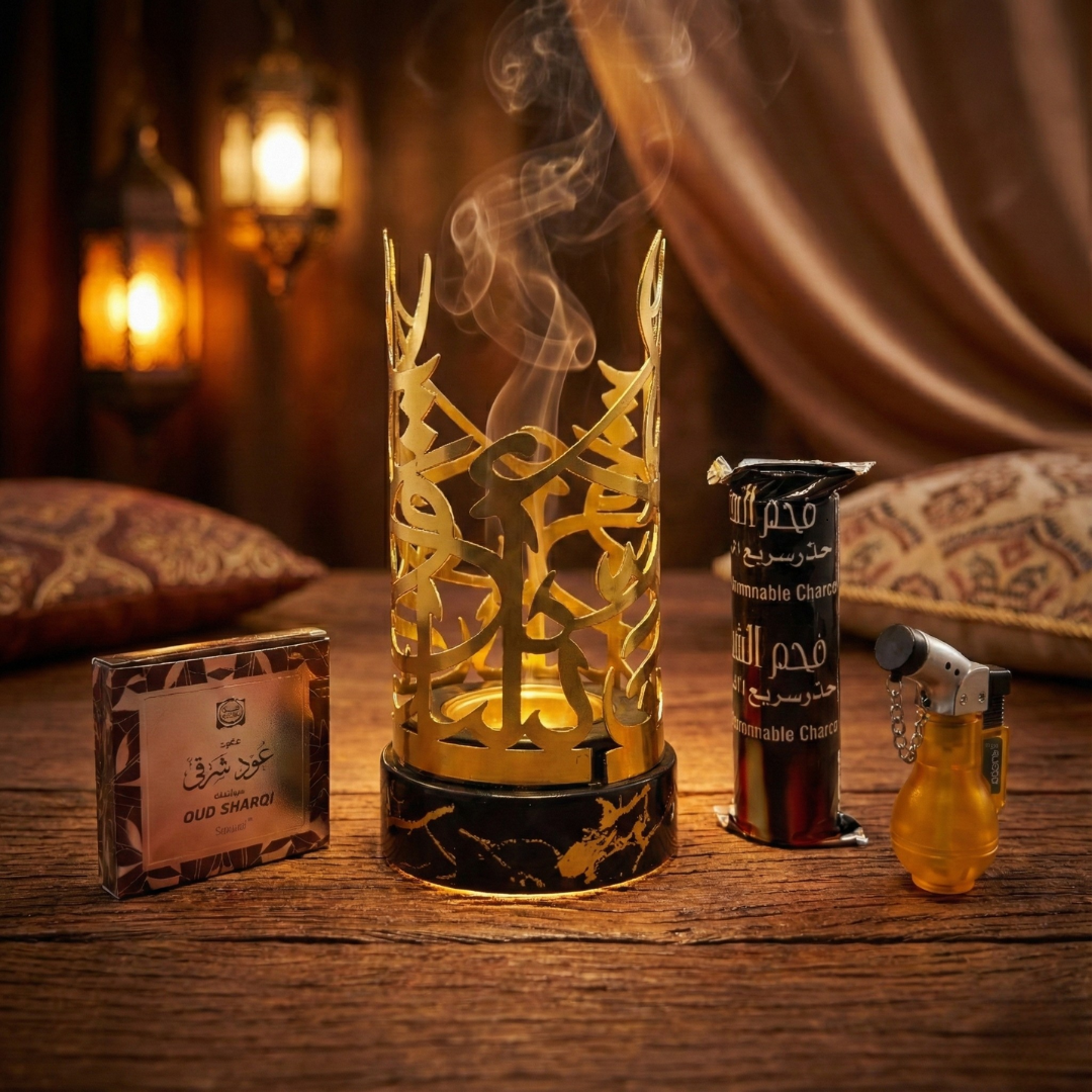 কি কি থাকছে (What’s Included): এটি একটি কমপ্লিট ৪-ইন-১ আর্ট সেট: ১. ক্যালিগ্রাফি বার্নার, ২. টর্চ লাইটার, ৩. কুইক-লাইট চারকোল এবং ৪. “উদ শার্কি” বাখুর ।